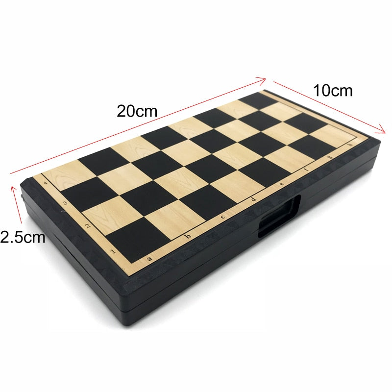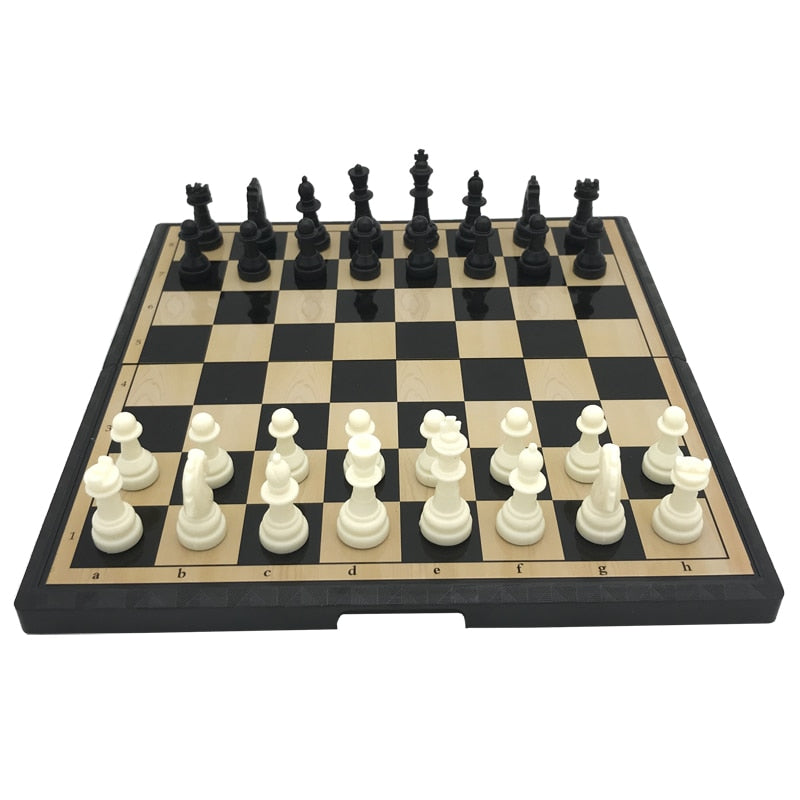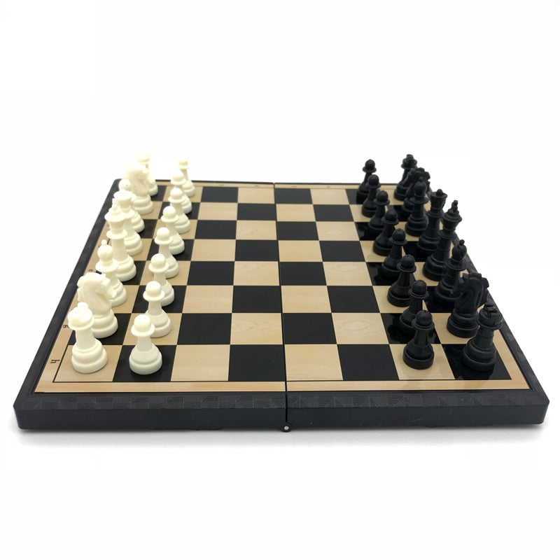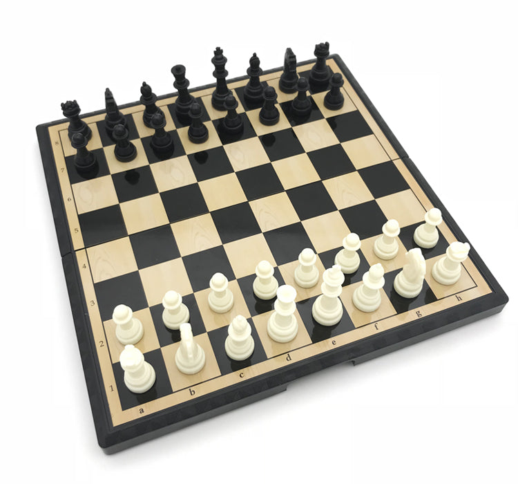 - Et klassisk, sammenleggbart sjakkbrett med brikker