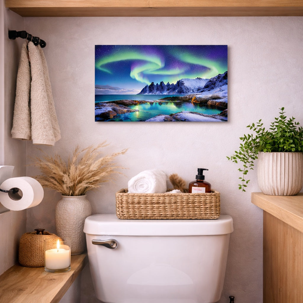Dette eksklusive lerretsbildet viser nordlys over det dramatiske landskapet på Senja – med arktisk kystlinje, snødekte fjell og speilblankt vann badet i grønt og lilla aurora-lys.